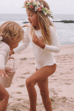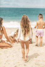 She’s cute, she’s comfy, she’s protective. Inspired by the surfers paradise in Dana Point, The Doheny rashguard features long sleeves and classic neckline to keep your littles covered in the sun. To elevate the design, the back hosts a zipper enclosure with oversized bow, whilst a touch of femininity has been added with our signature ivory ruffles to the leg.